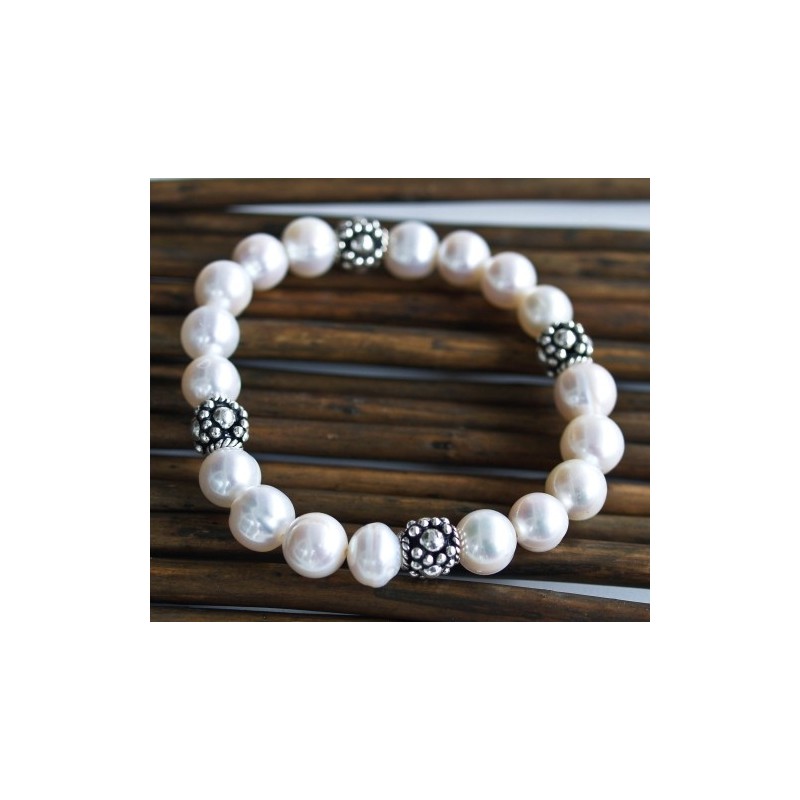 Klassiker! Elastisches Armband aus weissen Süsswasserperlen mit Einsätzen aus geschwärztem Silber 925. Länge des Armbandes ca. 19 cm.