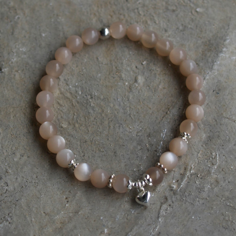 Elastisches Armband mit hellorangem Mondstein und Herzchenanhänger aus Silber 925