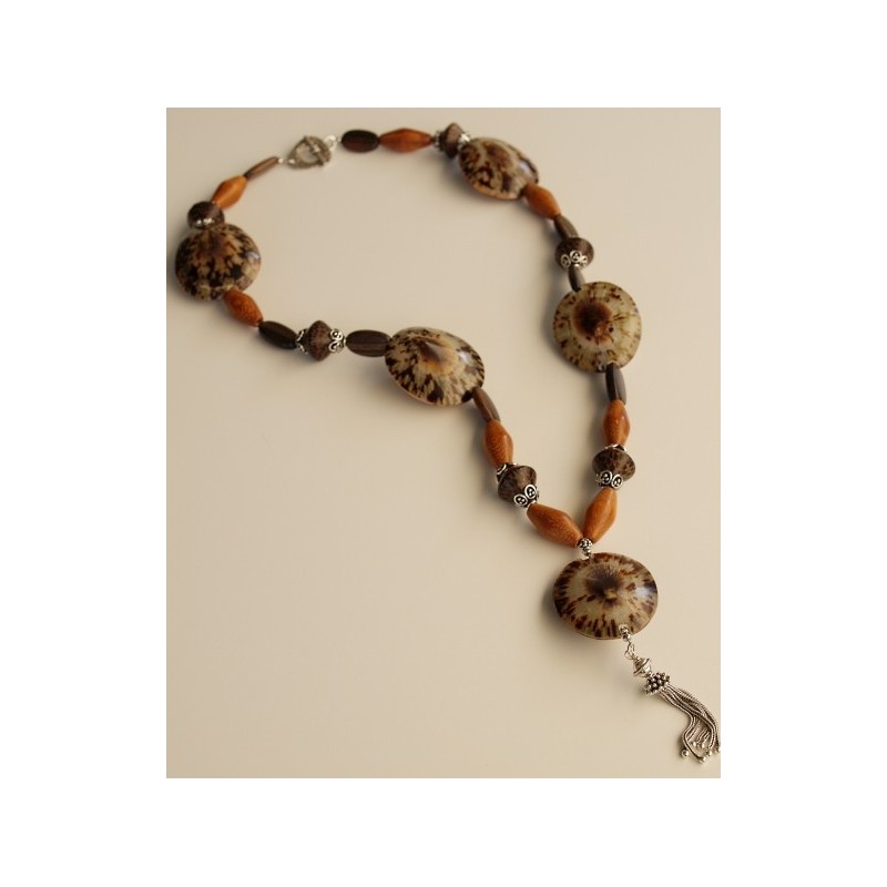 Mit dieser Kette setzen Sie Akzente! Halskette aus Holz (hell und dunkel), Perlen aus Palm-Holz, schönen Muscheln und Zwischenteilen aus Silber 925. Besonders schönes Detail die Quaste aus Silber 925. Länge der Halskette 70 cm.