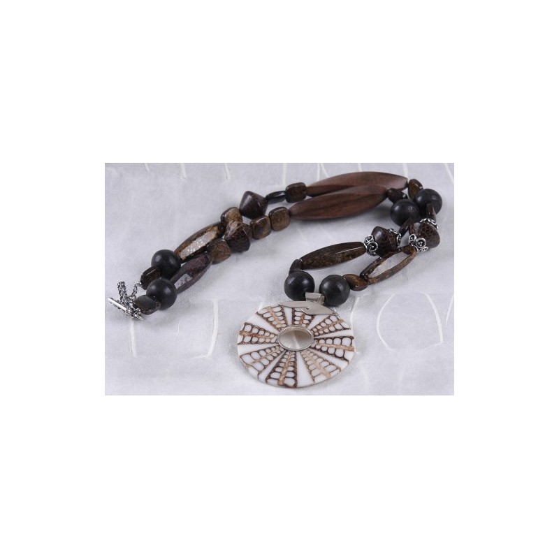 Mehr als nur ein modisches Accessoire! Halskette aus Bronzit, Eben- und Palmholz und Silber 925. Besonders schön ist der Anhänger aus Spider-Shell (Fassung aus Silber). Länge der Halskette 62.5 cm.