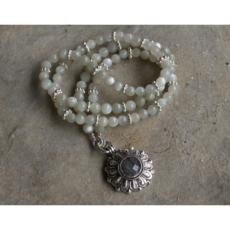 Gönnen Sie sich etwas Spezielles...! Halskette aus indischem Mondstein mit Einsätzen aus Silber 925. Alles andere als ein schlichter Hingucker ist der Blumen-Anhänger aus Silber 925 mit facettiertem grauem Achat. Länge der Halskette (inkl. Clip-Verschluss) 84.5 cm, Masse Anhänger: 4.5 x 3.5 cm.