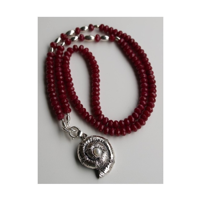 Trendig! Halskette aus Ruby (rekonstruierter Rubin) mit Einsätzen aus Silber 925. Auffallend schön dazu: der Anhänger Amonit aus Silber 925 besetzt mit Markasit und einer weissen Süsswasserperle. Länge der Halskette (inkl. Federringverschluss) 85 cm, Länge des Anhängers 5 cm, Durchmesser des Anhängers 3.5 cm.