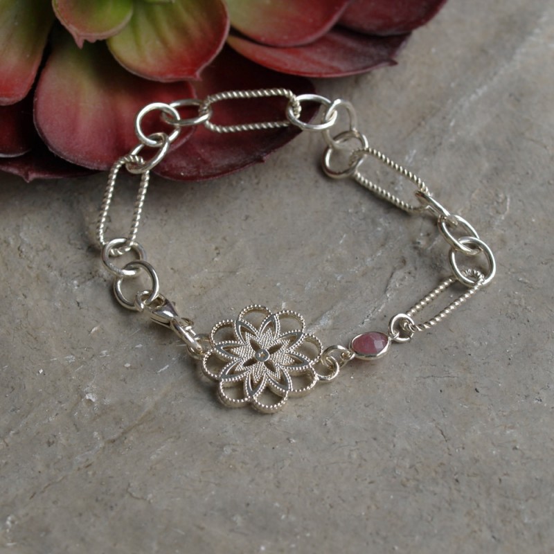 Ein besonders schöner Blickfang ist dieses Armband aus Silber 925 mit Blume und pink Topas