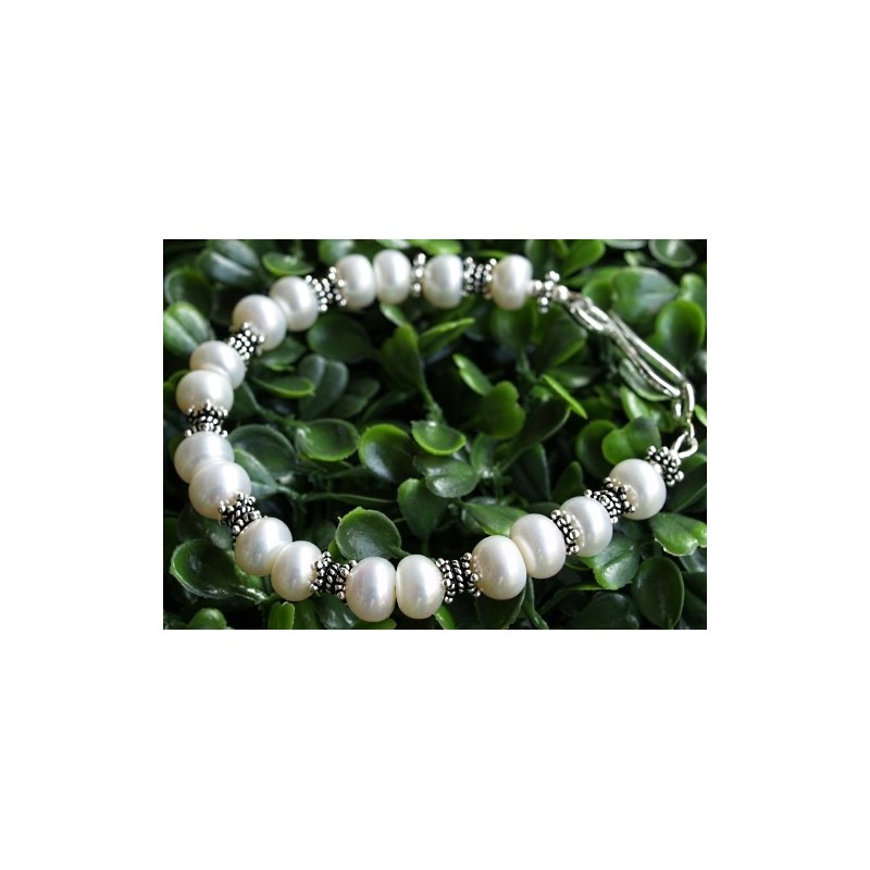 Edel, klassisch, zeitlos, schön... ein Muss! Armband aus weissen Süsswasserperlen (Bouttons) mit Einsätzen aus geschwärztem Silber 925 (S-Verschluss). Länge des Armbandes 21.5 cm.