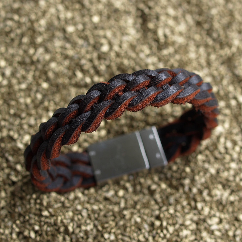 Schön geflochtenes Armband aus dunkelbraunem und leicht orangem Leder mit Edelstahl-Schliesse.