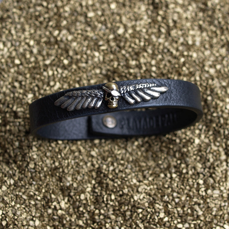Aus unserer Kollektion von Platadepalo: Armband aus schwarzem Leder, 1 cm breit, mit Applikation Totenkopf/Engelsflügel
