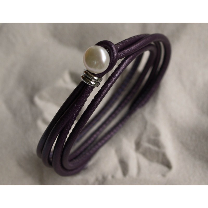Voll im Trend! Wickelarmband aus pflaumenfarbigem Leder mit weisser Süsswasserperle als Verschluss. Länge des Armbandes 19.0 cm.