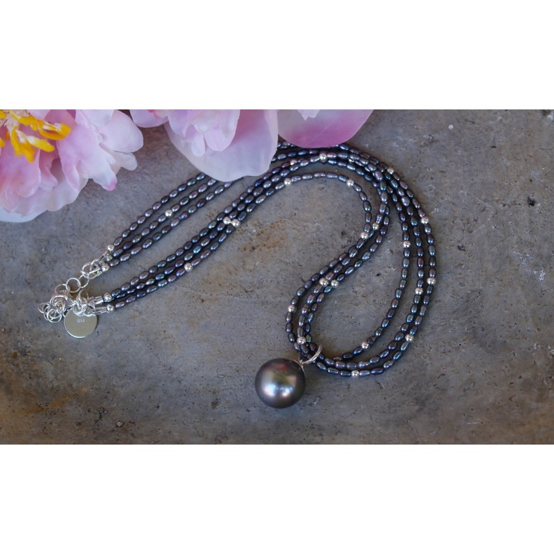 Einfach edel... dreireihige Halskette aus silberfarbigen Süsswasserperlen, Silber 925 mit Anhänger Tahiti-Perle.