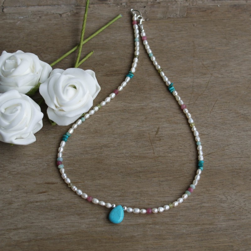 Bunter Mix... Halskette aus weissen Süsswasserperlen, Türkis, Amazonit, Peridot, Turmalin und Achat