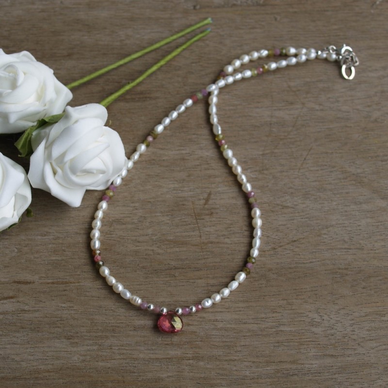 Traumhaft schön... Halskette aus weissen Süsswasserperlen, Peridot, Rubin und Pink Topaz