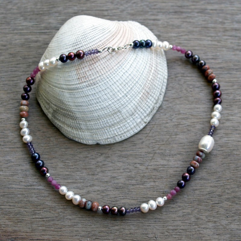Wer bunt durchs Leben geht, hat mehr davon... Boho-Halskette mit Süsswasserperlen, Amethyst, Turmalin, afrikanischem Opal und Silber 925