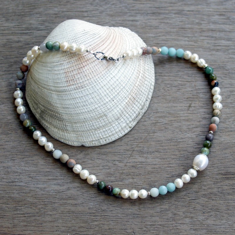 Lebensfreude... Boho-Halskette mit Süsswasserperlen, Amazonit, afrikanischem Opal, Achat und Silber 925