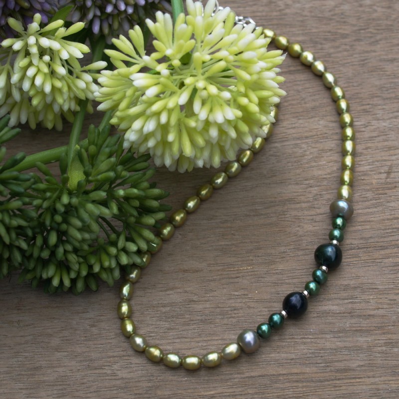 Evergreen... Halskette aus grünen und blauen Süsswasserperlen, Silber 925