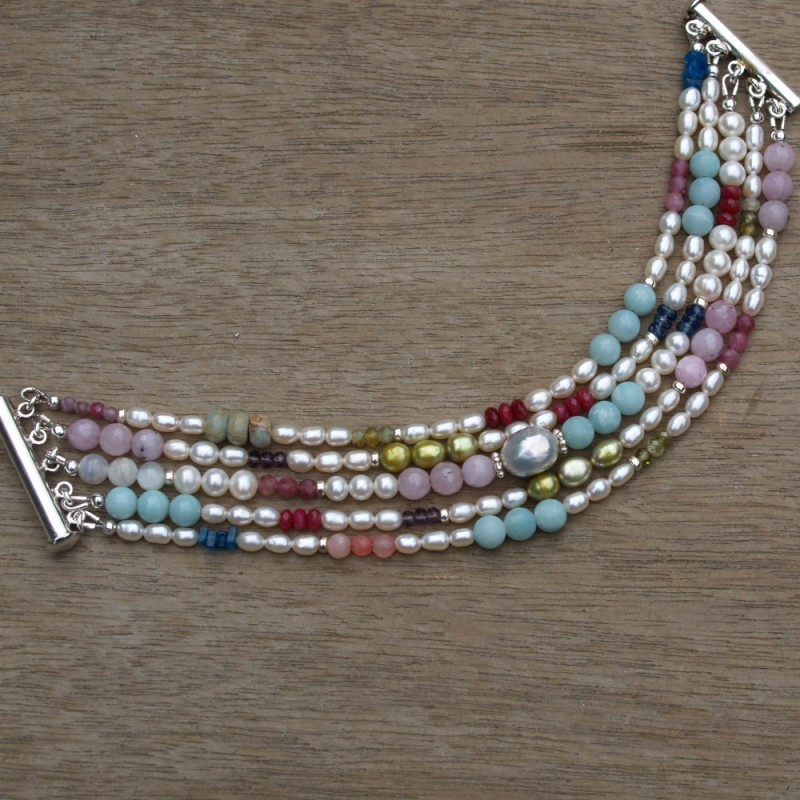 DER Blickfang! Fünfreihiges Armband mit Süsswasserperlen, Silber 925, Turmalin, Kyanit, afrikanischem Opal, Amazonit, Granat, Achat, Mondstein und Apatit
