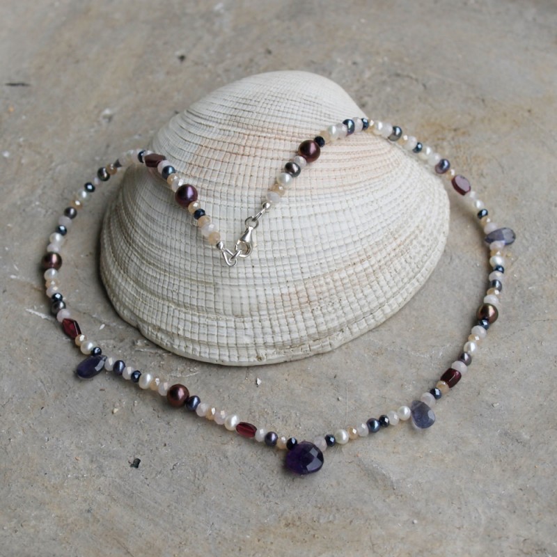 Summer is magic! Mit dieser wunderschönen kurzen Halskette mit Süsswasserperlen, Granat, Iolith und Amethyst zeigst du Farbe. Ob einzeln oder in Kombi mit mehreren Halsketten getragen ist diese Halskette immer ein Blickfang.