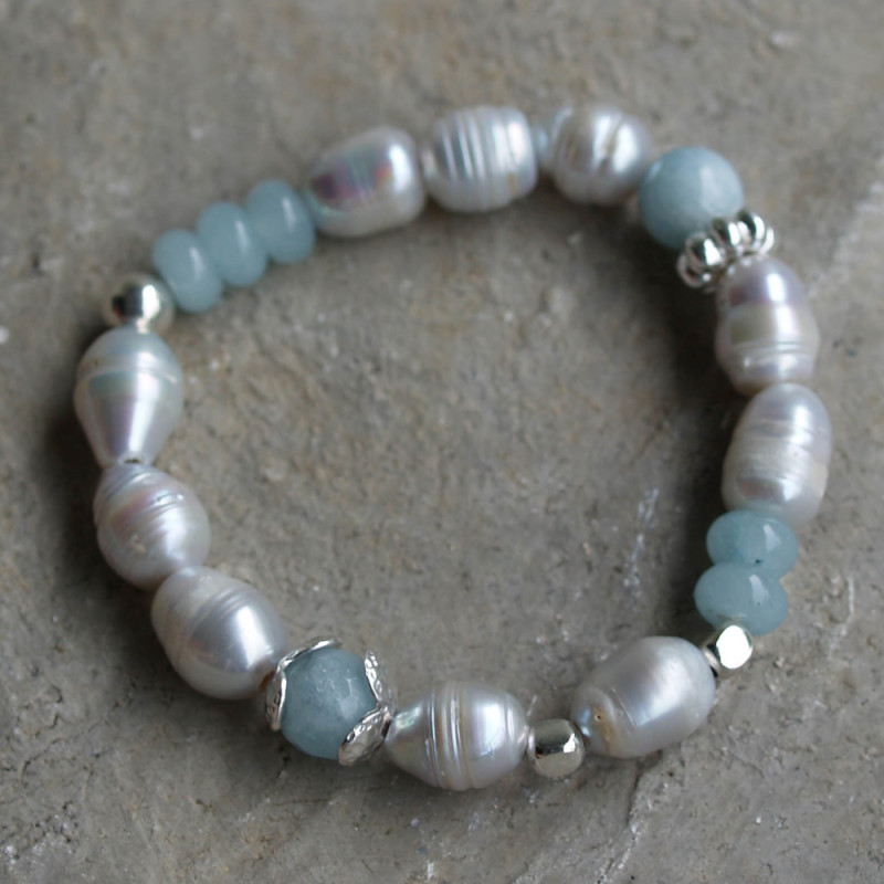 Sommer chic: Elastisches Armband mit grossen hellgrauen Süsswasserperlen, Aqquamarin und Silber 925