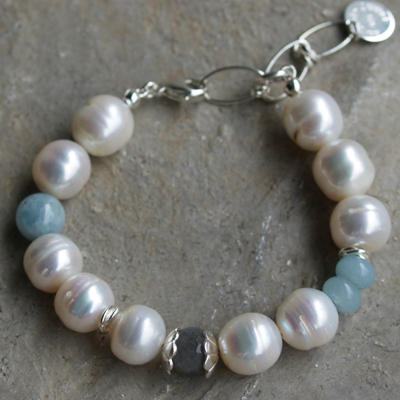 Sommer chic: Armband mit grossen weissen Süsswasserperlen, Aquamarin, Labradorit und Silber 925.