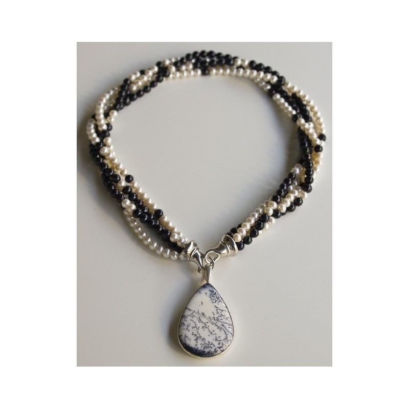 Traumhafte Winterlandschaft! Mehrreihige Halskette aus weissen und schwarzen Süsswasserperlen. Anhänger aus Silber 925 mit Dendriten-Achat. Länge der Halskette 48 cm, Länge des Anhängers 6 cm, Durchmesser des Anhängers 3.5 cm.