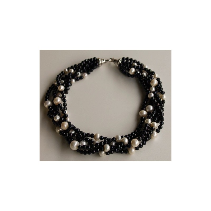 Klassiker in Schwarz-Weiss! 6-reihige Halskette aus schwarzen und weissen Süsswasserperlen. Länge der Halskette 48 cm.