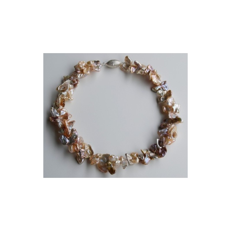 Traumhaftes Meisterstück! Halskette aus Keshi-Perlen mit handgefertigten Einsätzen aus Feinsilber, geknüpft. Länge der Halskette 50 cm.