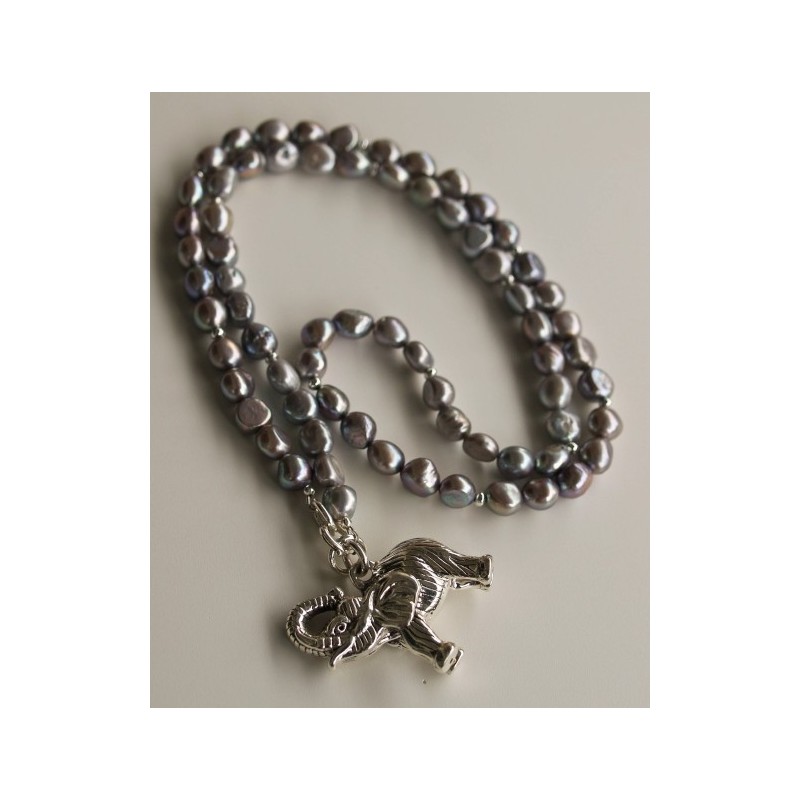 Tierisch schön! Halskette aus silbergrauen Süsswasserperlen mit Einsätzen aus Silber 925. Anhänger: Elefant aus Silber 925. Länge der Halskette (inkl. Federring-Verschluss) 82.5 cm, Länge des Anhängers 4 cm, Durchmesser des Anhängers 4.5 cm.