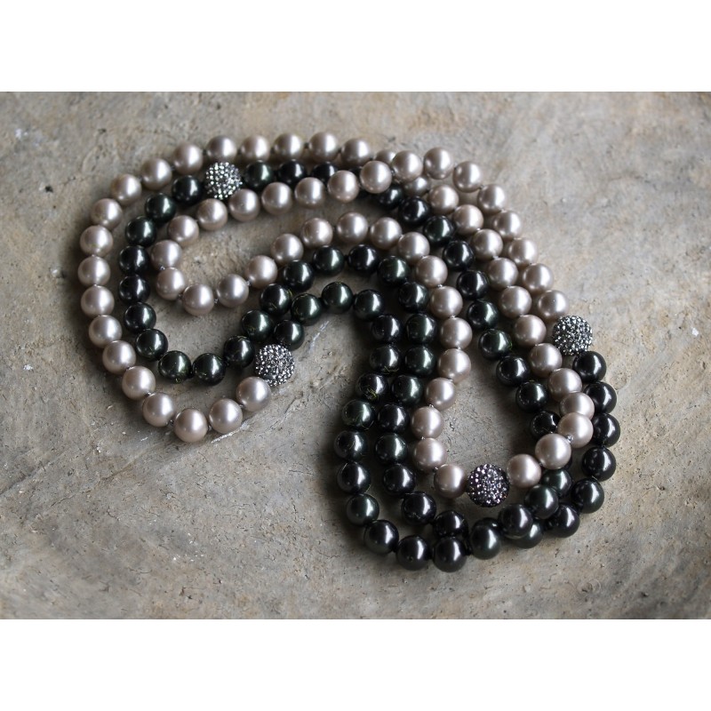 Das besondere Accessoire! Lange Halskette aus Muschelkern-Perlen und Kunststoff-Perlen, besetzt mit Strass.