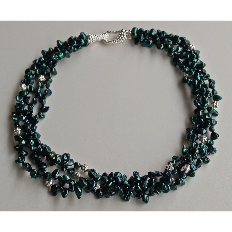 Kann Grün denn schöner sein? Mehrreihige Halskette aus grünen Süsswasserperlen mit Blümchen und Verschluss aus Silber 925. Länge der Halskette 51 cm.