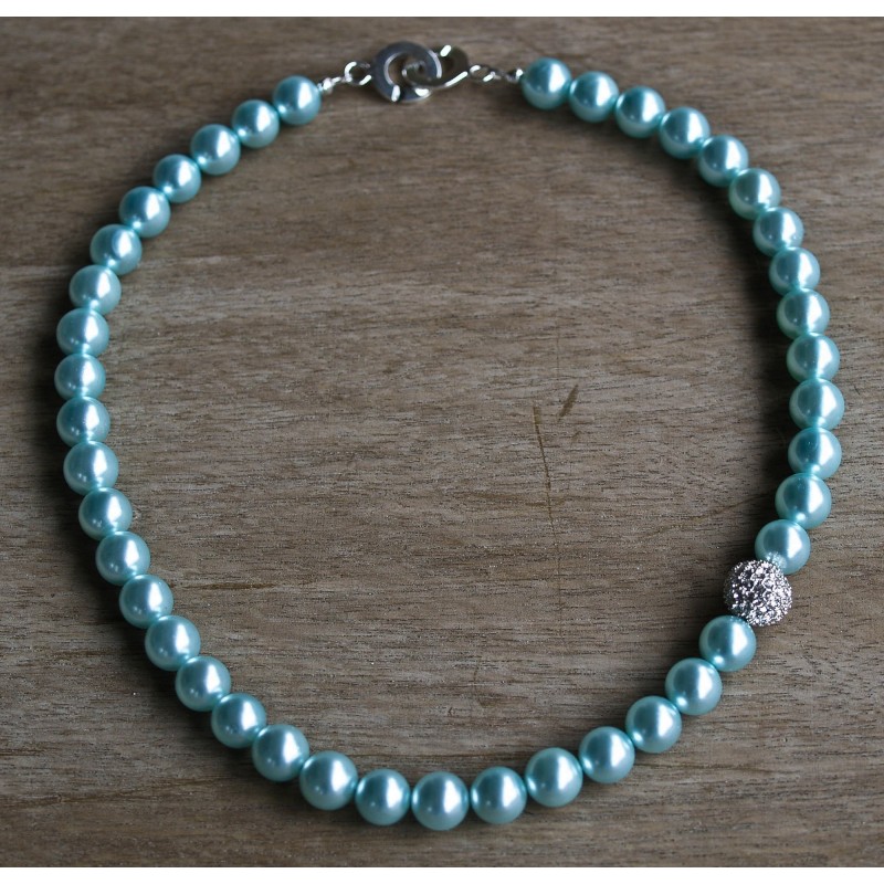 Ganz schön Sommer! Halskette aus mintgrünen Muschelkern-Perlen mit einer Perle aus Silber 925 rhodiniert, besetzt mit Zirkonia und Verschluss aus Silber 925. Länge der Halskette 47 cm.