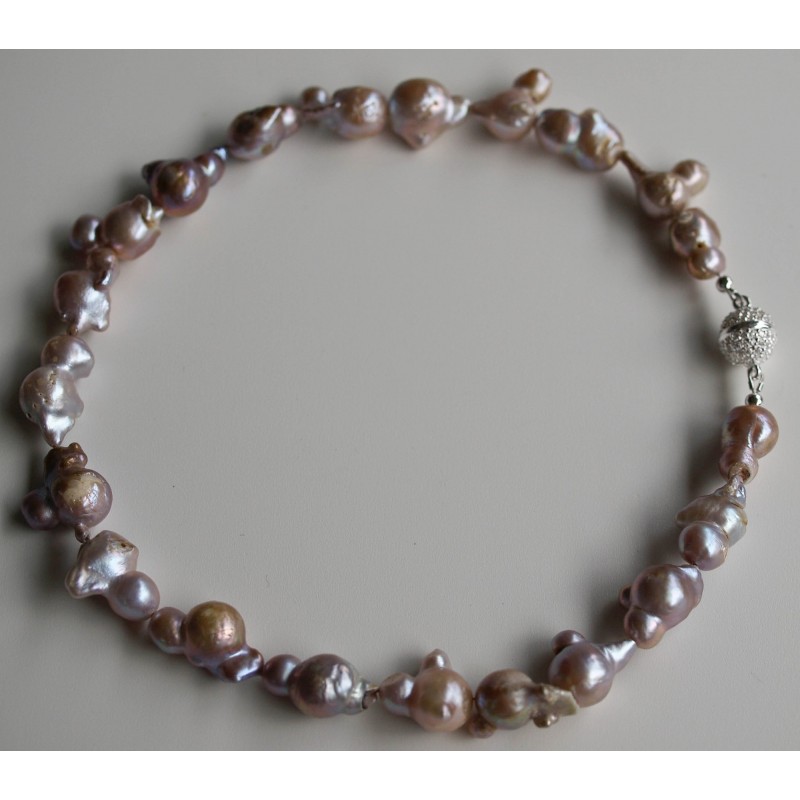 Fantasy! Halskette aus lila-farbigen Süsswasserperlen mit Magnet-Verschluss aus Silber 925, besetzt mit weissen Zirkonia. Länge der Halskette 44.0 cm.