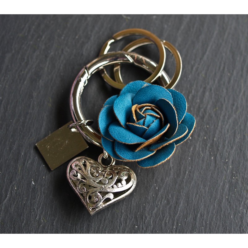 Aus der Serie "Heart & Rose": Schlüsselanhänger/Taschenbaumler Herz mit türkiser Leder-Rose.