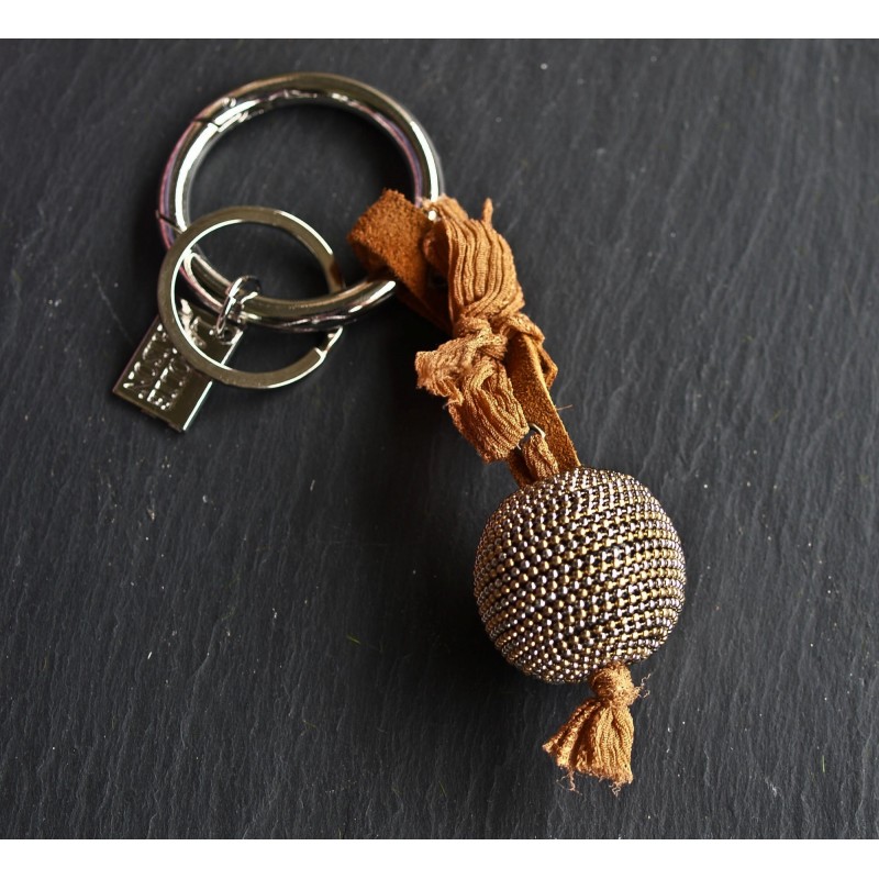 Schlüsselanhänger/Taschenbaumler Kugel mit orange-braunem Leder und Schleifchen.