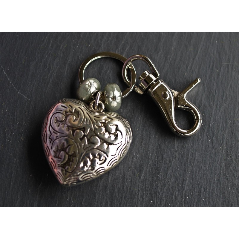 Aus der Serie "Herzlich": Schlüsselanhänger/Taschenbaumler mit grauen Glasperlen. Masse Herz: 5 x 5 cm.