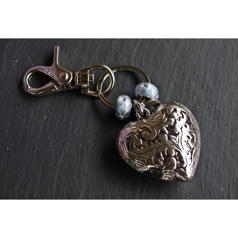 Aus der Serie "Herzlich": Schlüsselanhänger/Taschenbaumler mit hellblauen Glasperlen. Masse Herz: 5 x 5 cm.