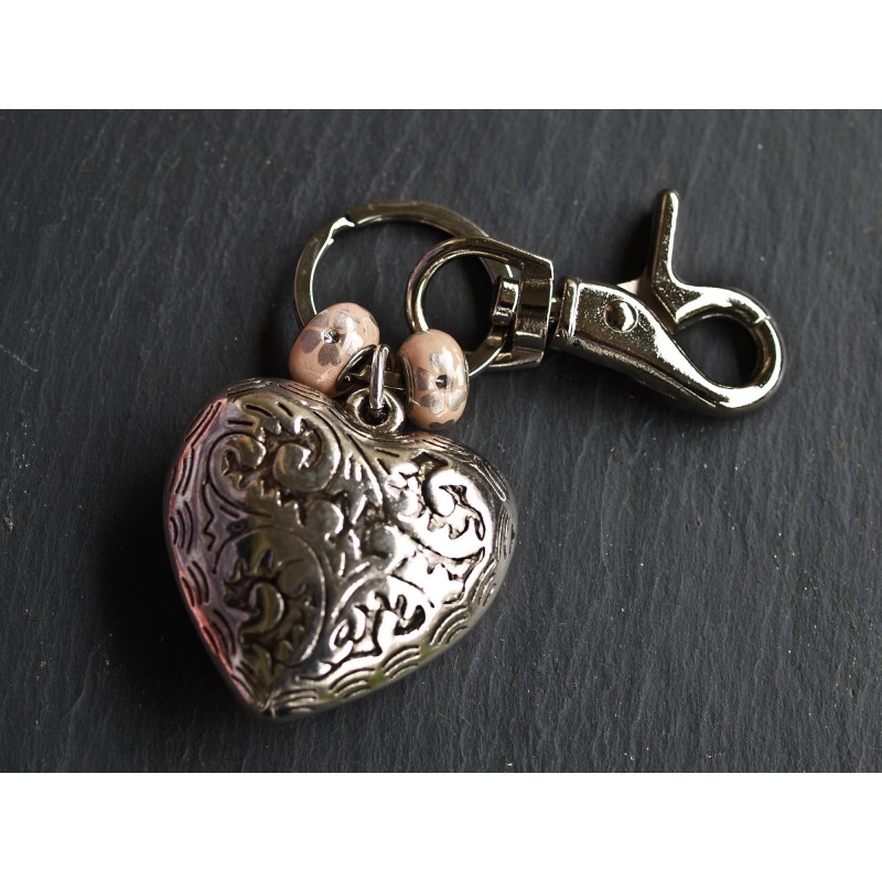 Aus der Serie "Herzlich": Schlüsselanhänger/Taschenbaumler mit apricot-farbigen Glasperlen. Masse Herz: 5 x 5 cm.
