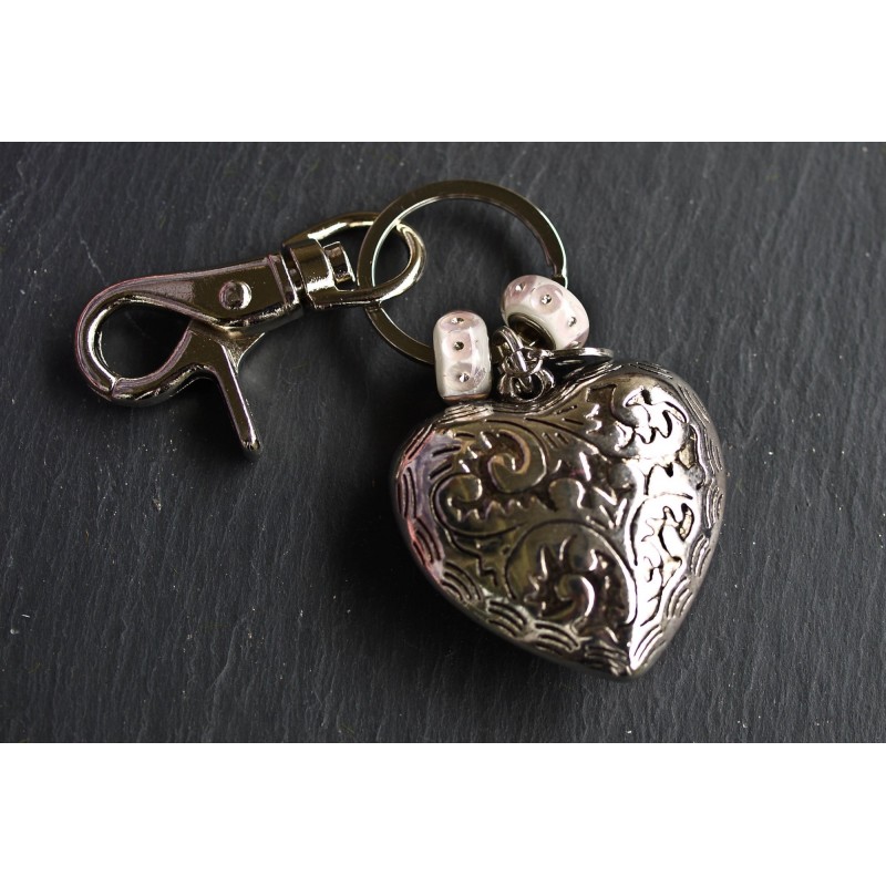 Aus der Serie "Herzlich": Schlüsselanhänger/Taschenbaumler mit weiss-rosa Glasperlen. Masse Herz: 5 x 5 cm.