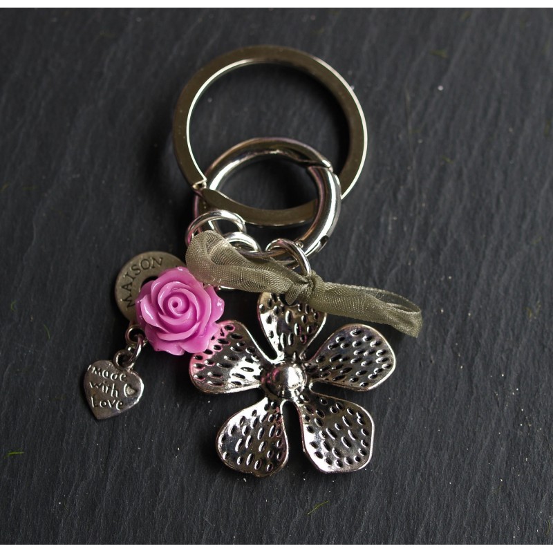 Aus der Serie "Blumig": Schlüsselanhänger/Taschenbaumler Blume mit pink Rose und oliv Schleifchen. Masse Blume: 3 x 3 cm.