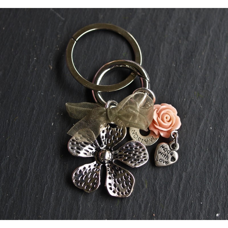 Aus der Serie "Blumig": Schlüsselanhänger/Taschenbaumler Blume mit apricot Rose und oliv Schleifchen. Masse Blume: 3 x 3 cm.