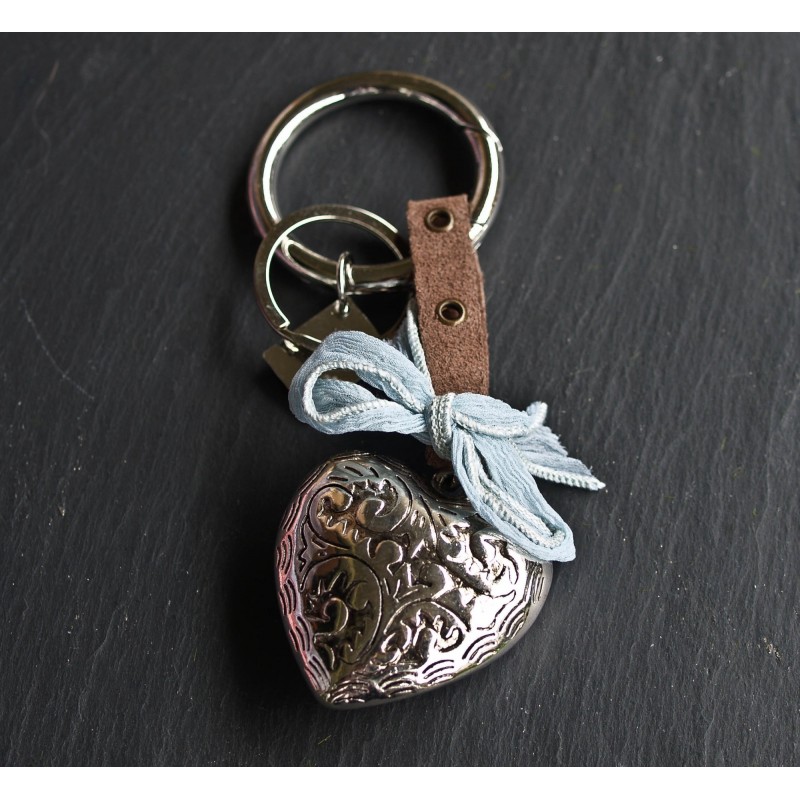Schlüsselanhänger/Taschenbaumler Herz mit braunem Leder und hellblauer Schleife. Masse Herz: 5 x 5 cm.