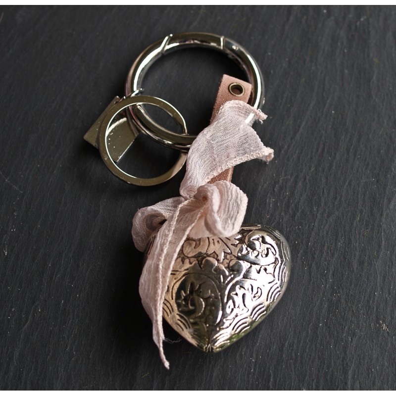 Schlüsselanhänger/Taschenbaumler Herz mit rosa Leder und Schleifchen. Masse Herz: 5 x 5 cm.