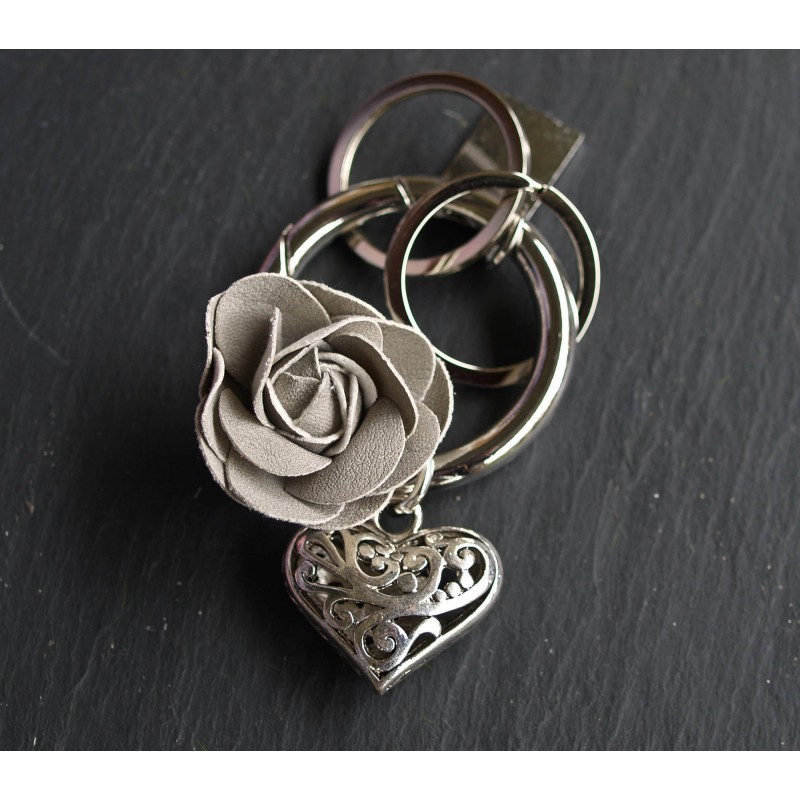 Aus der Serie "Heart & Rose": Schlüsselanhänger/Taschenbaumler Herz mit hellgrauer Leder-Rose.
